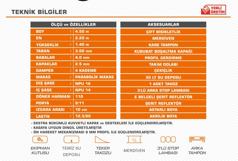 10 Ton Çift Dingil Standart modeli kale römorkları 10 ton kapasiteli yüksek teknoloji ile üretilmiş bir römorktur. Gelişen römork teknolojisi doğrultusunda el frenli olarak üretilmektedir. Bir opsiyon degil standart donanımdır el freni. Römorklarda kullanılan döner parçaların tümü 2 yıl garanti kapsamındadır . Opsiyon olarak çadır 'da eklenebilmektedir. Tekerlek ölçülerinde bir farklılık istenirse ekstra olarak eklenebilmektedir. Kale römork bir konya firmasıdır ve üretim merkezi konyadadır. Geniş servis ağı ile ve sulamax güvencesi ile bu ürüne şimdi indirimli sahip olabilirsiniz.