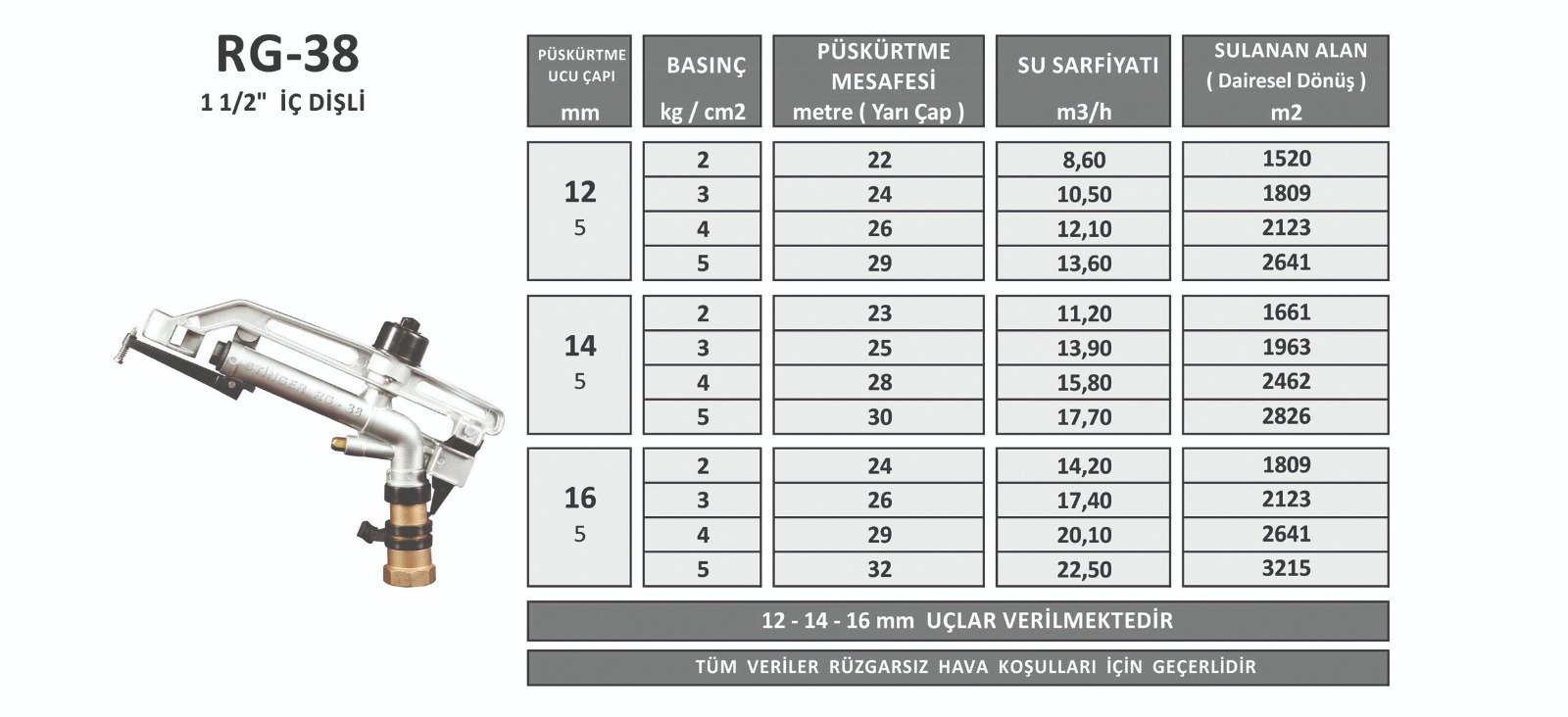 Stinger RG 38 Sprink  Tam ve Açı ayarlı olarak sulama yapabilir. Orta boy ve Büyük Sprink olarak kullanabileceğiniz bir başlıktır. Yedek nozul ölçüleriyle 8 ton ile 23 tona kadar su tüketimine sahiptir. 22 metre ile 32  metre mesafe atışına sahiptir.